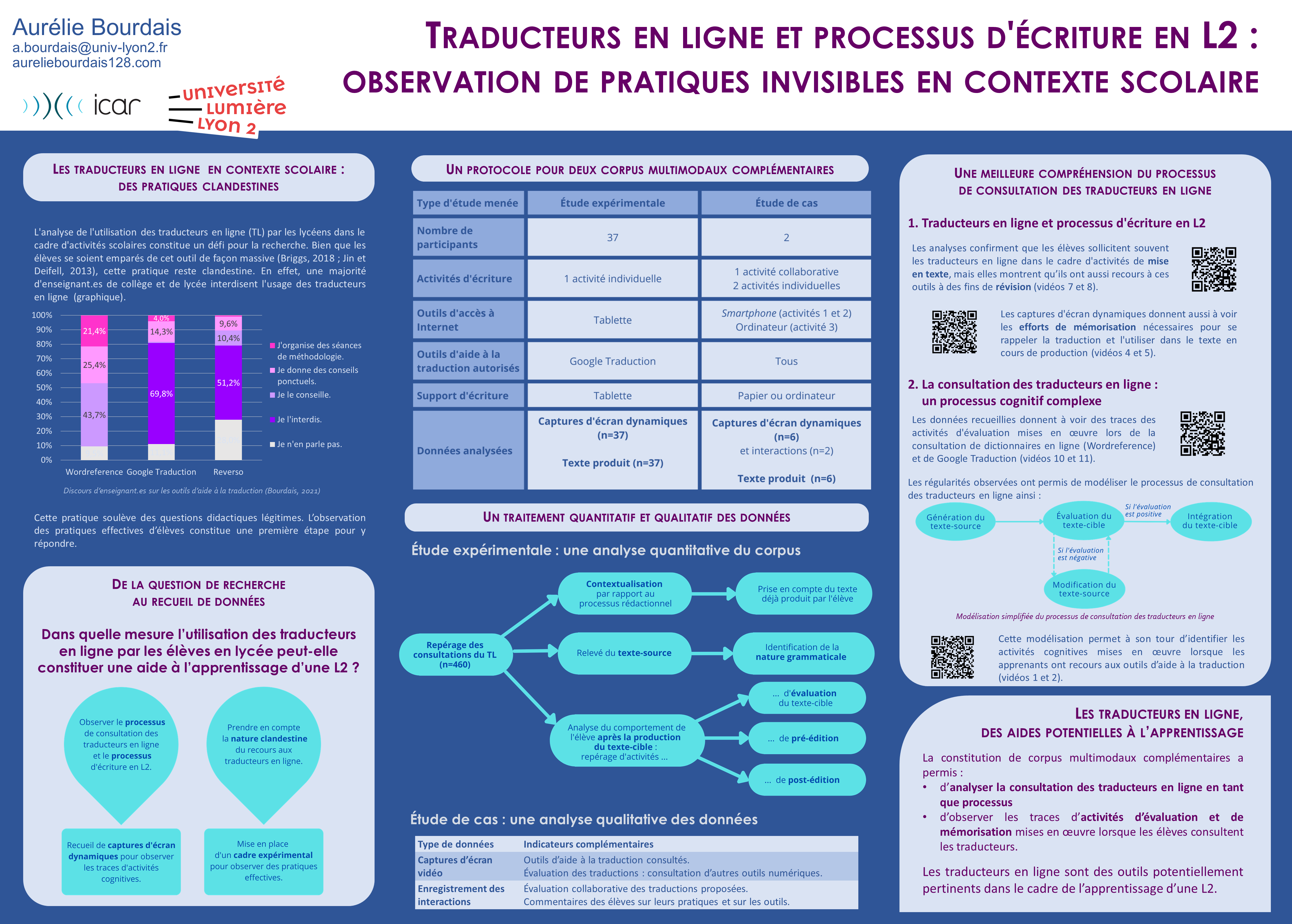 La nature clandestine du recours aux traducteurs en ligne en contexte scolaire constitue un défi lorsqu’il s’agit d’observer cette pratique. Le poster suivant présente le protocole qui a donné lieu à un recueil de données complémentaires. Ce poster a été réalisé pour la journée d’étude « Constitution de corpus écrits d’apprenants en contexte universitaire » (Grenoble, 18 mars 2022).